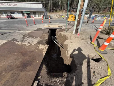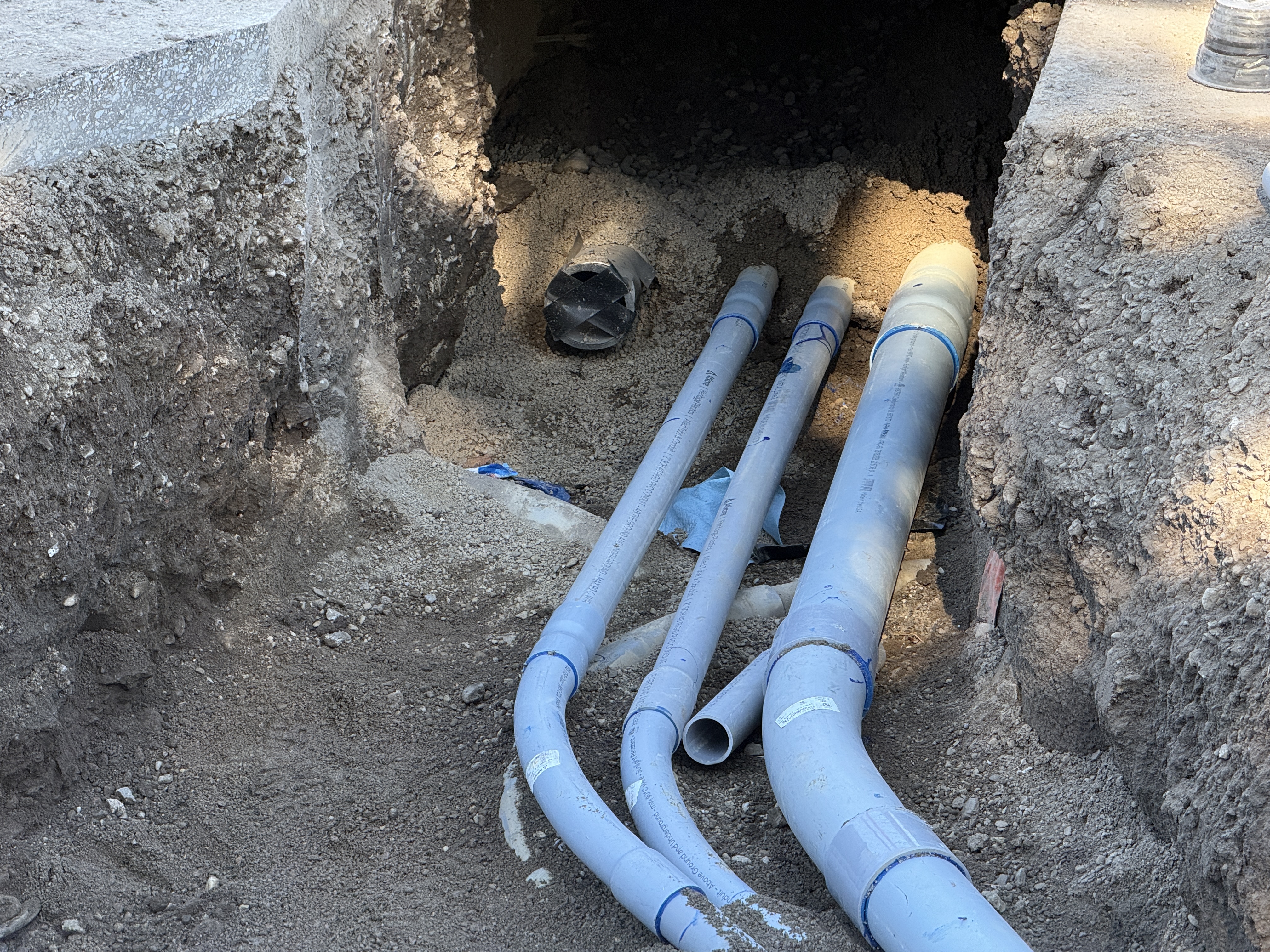 The photo shows an active pipeline installation in progress, with multiple blue PVC pipes laid in an open trench. The pipes appear to be set for alignment and connection as part of an underground utility project. The trench is partially backfilled with soil, suggesting the work is at an early to mid-phase stage of installation.
