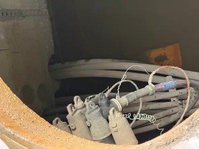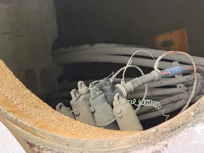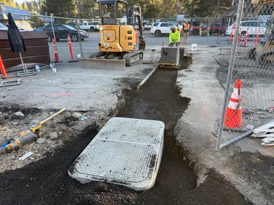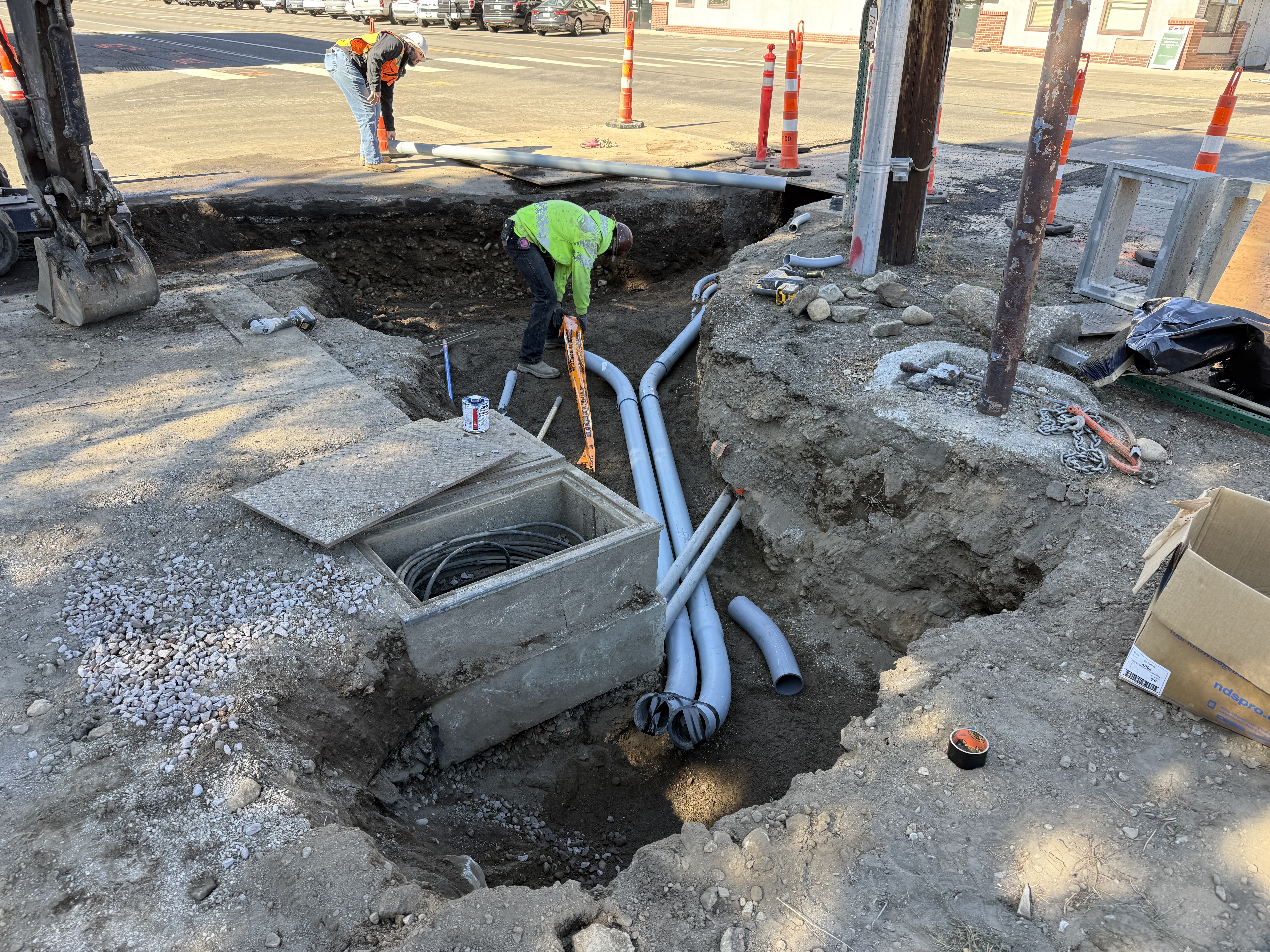 The image shows two workers installing electrical conduits into a trench. Multiple gray PVC conduits are being laid and aligned, indicating ongoing pipeline installation. A small concrete vault is partially open with exposed cables. The site is in the mid-construction phase with groundwork and utility placement underway.