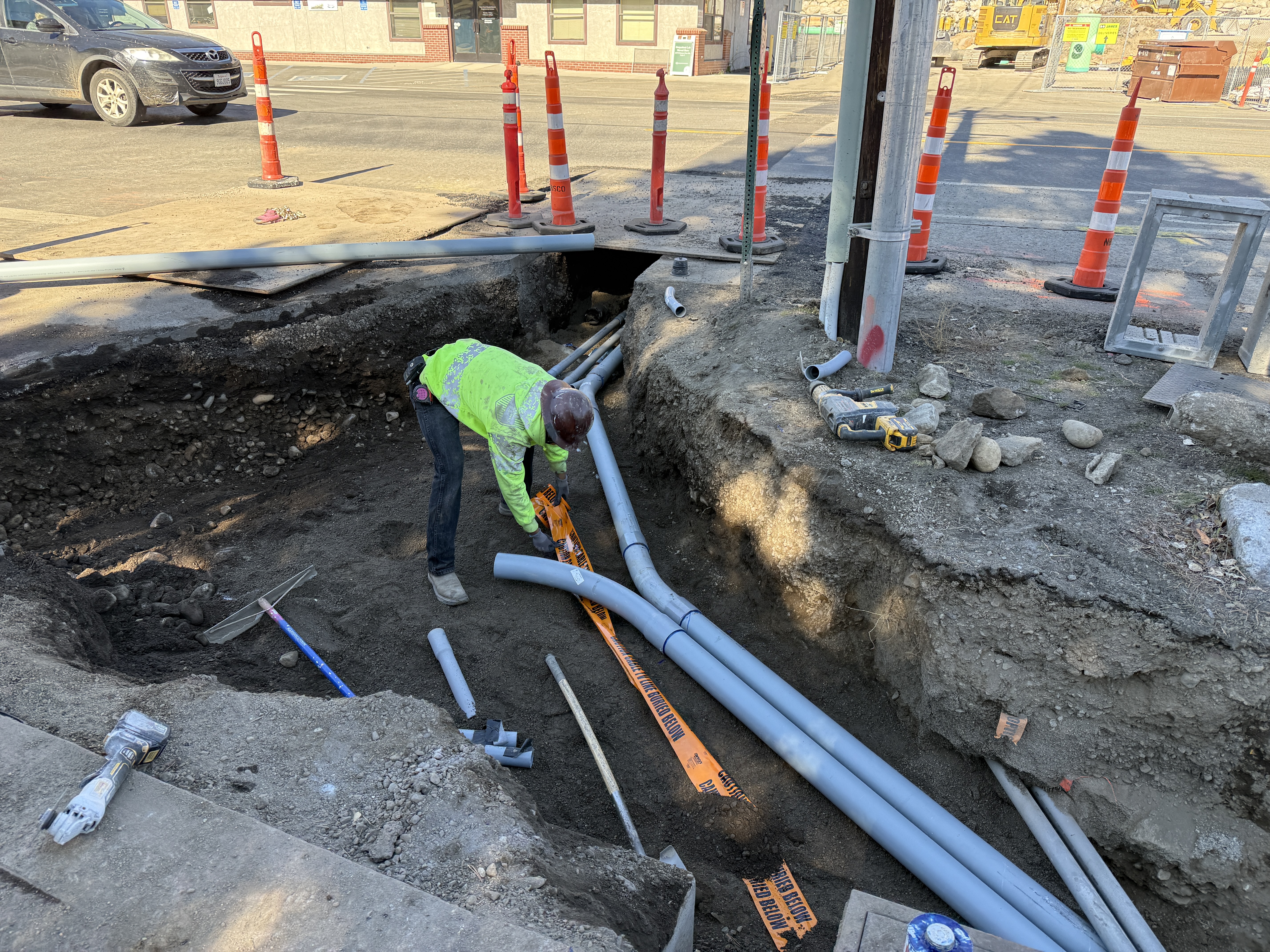 The photo depicts a worker handling and installing PVC conduit pipes in a trench. The installation involves connecting and laying multiple pipes, likely as part of underground utility work. The site is prepared with some laid pipes, indicating an advanced stage of construction. A power tool and other small tools are visible, suggesting active work on pipe fitting or adjustment.