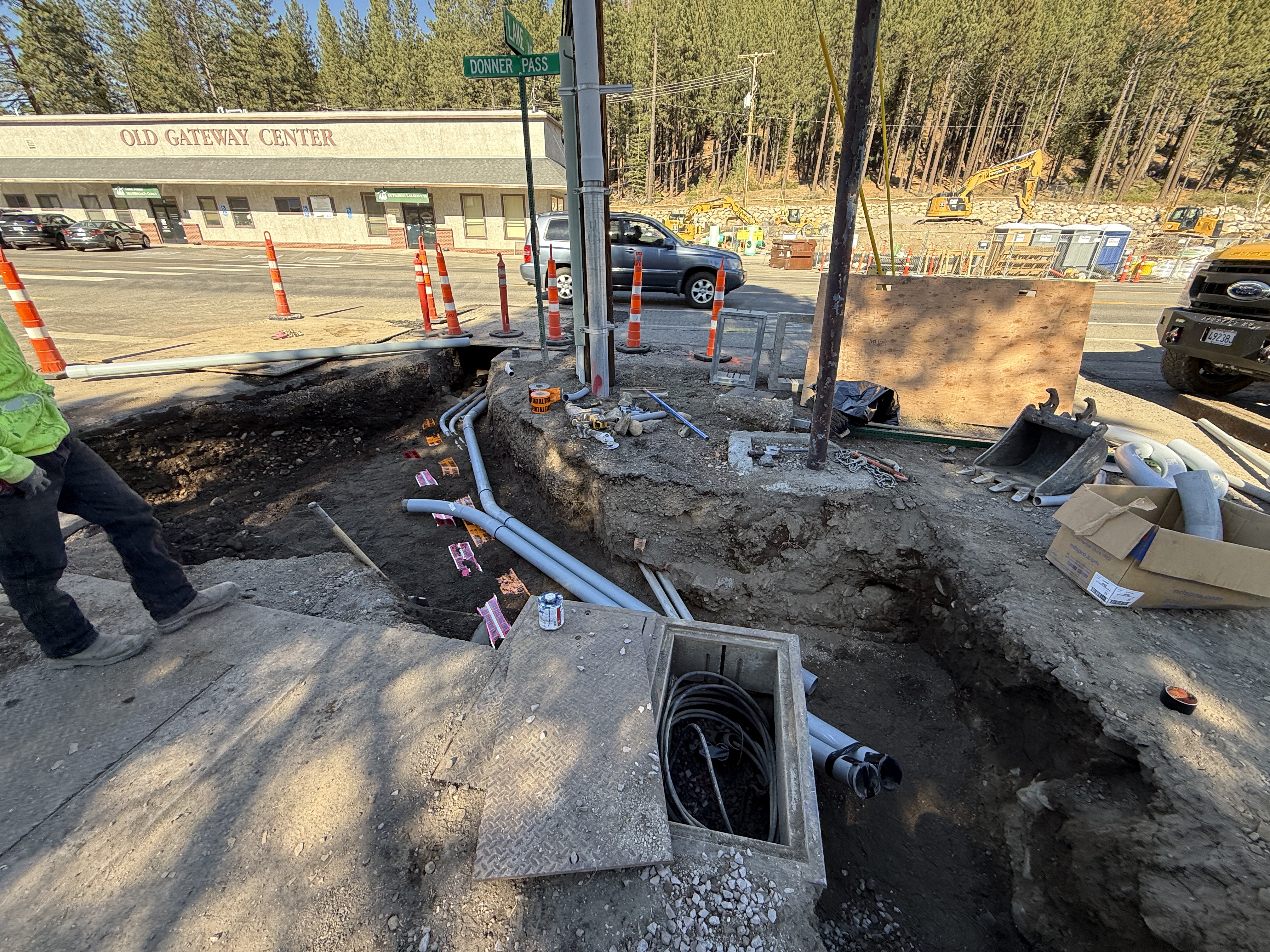 The image shows an active underground utility construction site with pipes laid in an excavated trench. Various PVC conduits are visible, likely for water or utility lines. The site is in the trenching phase, with orange traffic cones marking the perimeter, indicating an active work zone next to a street. Construction materials and equipment, including a cardboard box and digging tools, are present around the trench.