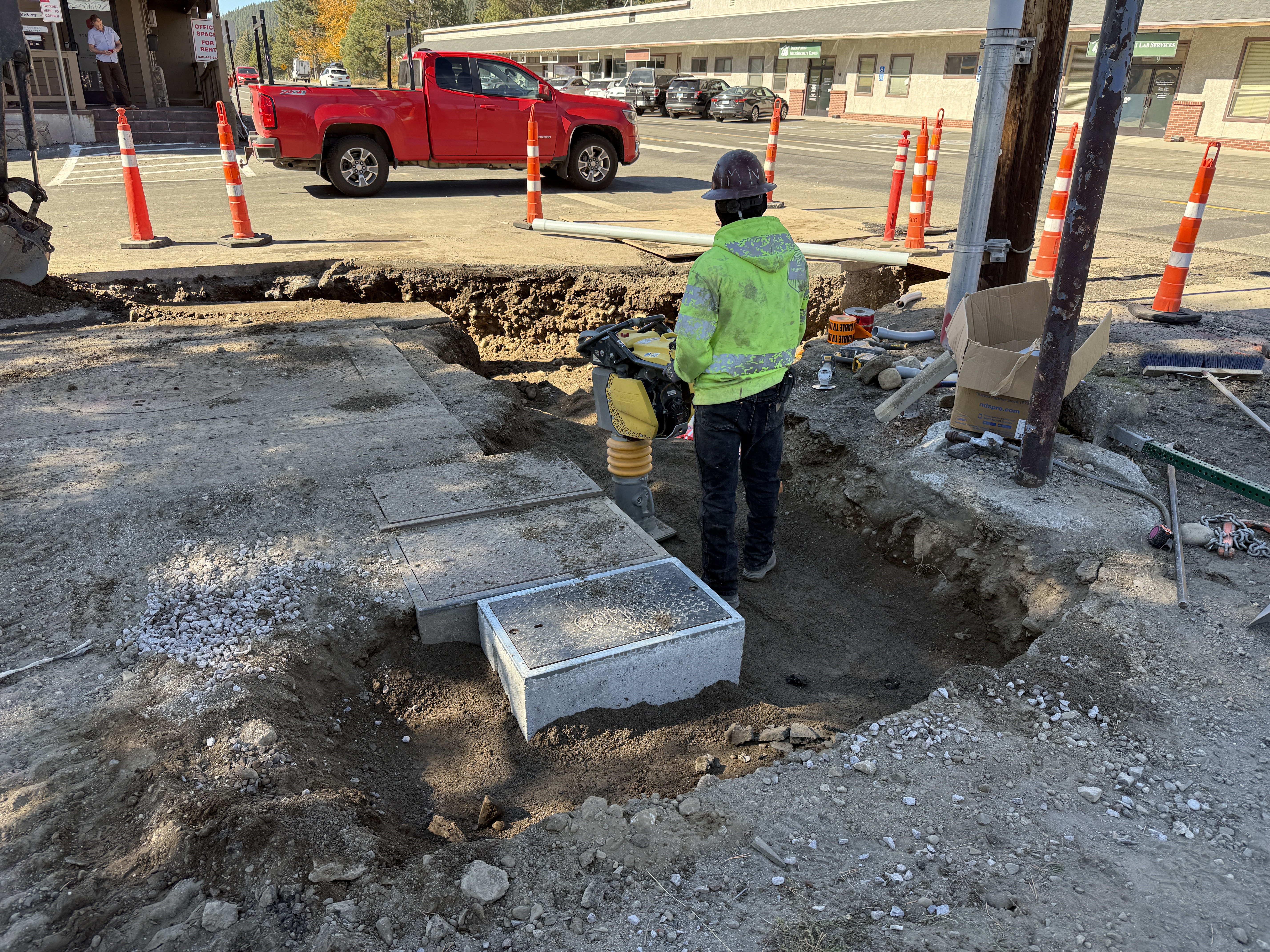 The photo shows a construction worker compacting soil in a trench with a vibrating compactor on a water infrastructure project. There are concrete access panels and a partially filled trench visible, indicating mid-phase trench work for utility installation. Traffic cones and a temporary utility pole suggest site safety and utility guidance measures.