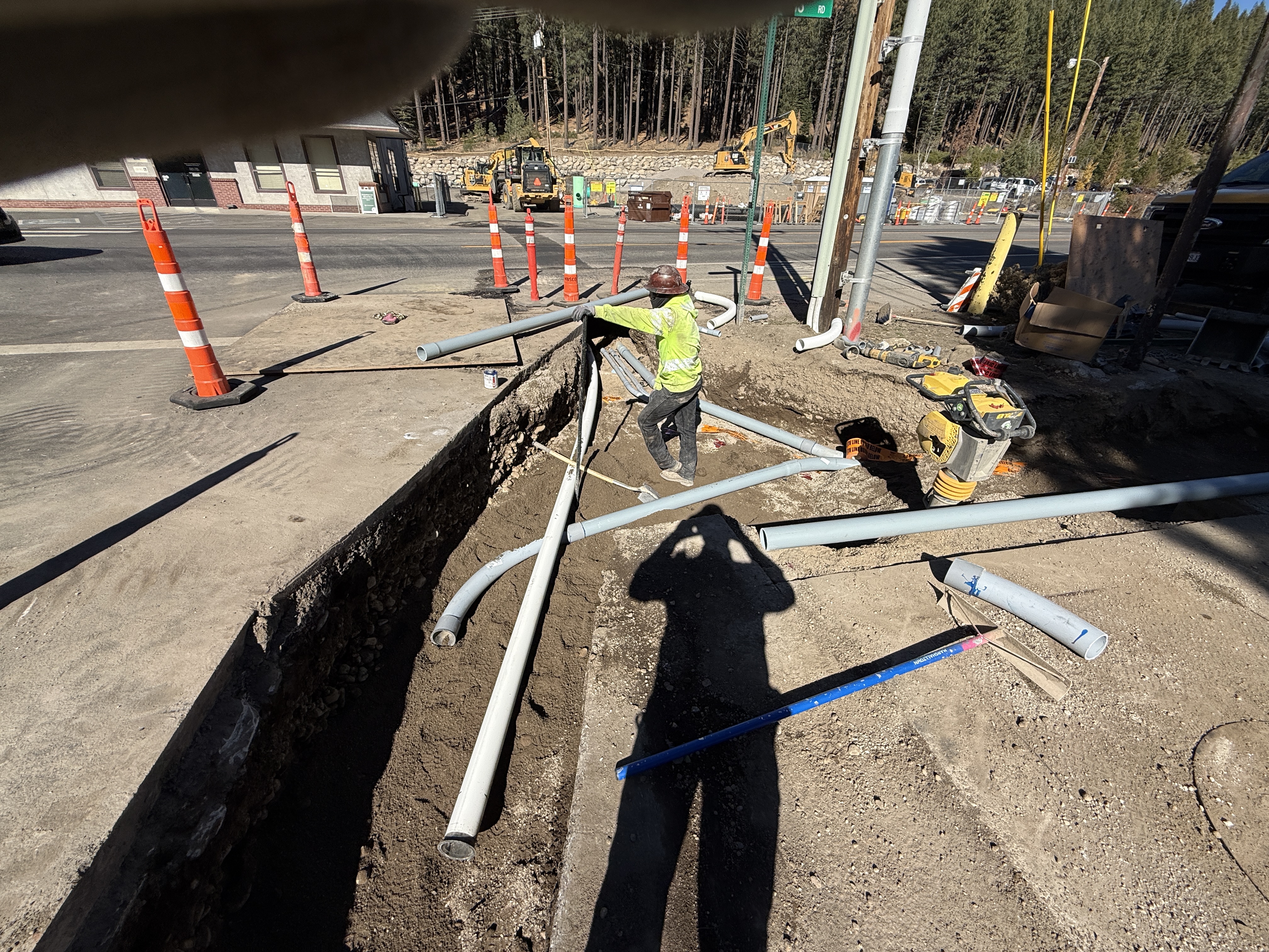 The photo shows active pipeline installation where a worker is adjusting PVC conduits within a trench. The site is marked with orange safety cones, and the trenchwork indicates an ongoing phase of conduit placement for underground utility lines. The soil is compacted around the pipes, suggesting preparation for backfill.