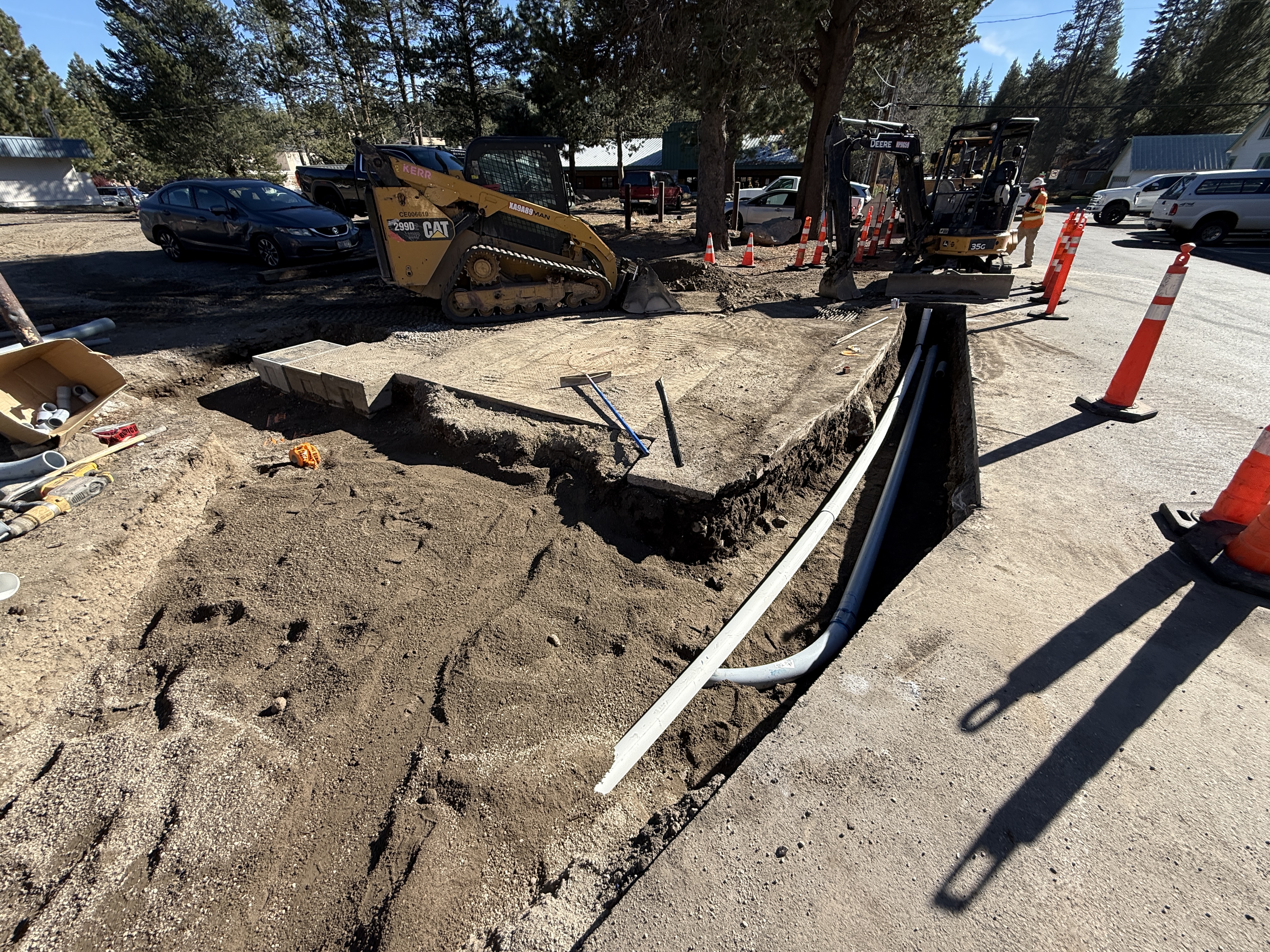 The image shows active trench excavation work for underground utility installation. Workers are managing the installation of PVC electrical conduit pipes within a prepared trench, using heavy machinery. A backhoe loader and a mini excavator are present, indicating ongoing trench work. The site is organized with traffic cones and partially backfilled sections beside open trenches.