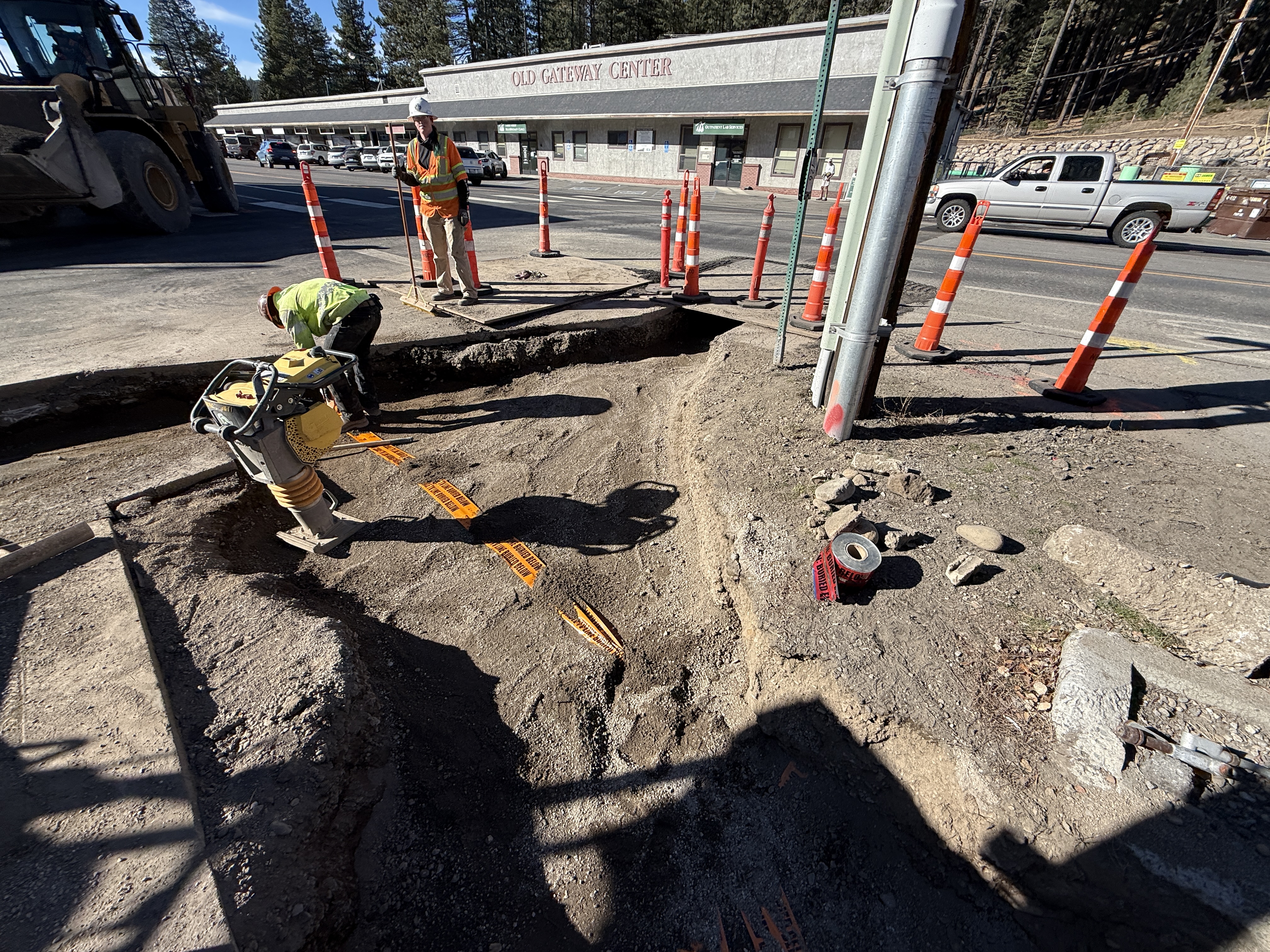 The photo shows two construction workers in the process of backfilling a trench as part of a water infrastructure project. One worker is operating a plate compactor to compact the soil, while another oversees the activity. There are orange locator tapes laid over the trench, indicating buried utilities below.