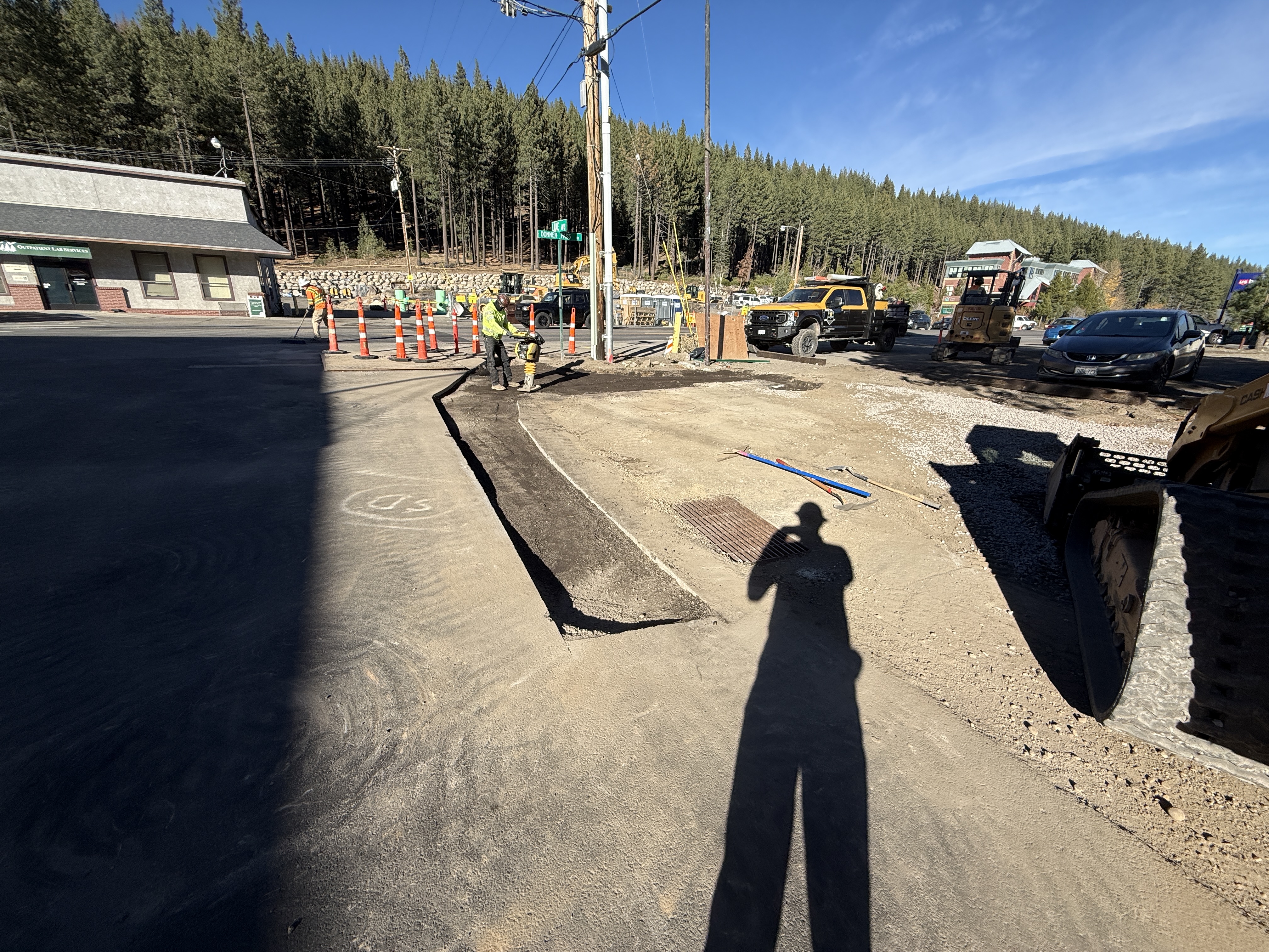 The photo shows active construction work involving trench preparation and infrastructure installation. Workers in high-visibility vests are present, indicating ongoing site activities. There is heavy machinery like a compactor and a truck, and the area is marked with traffic cones, suggesting a focus on site grading and surface restoration. The space shows initial stages of trench excavation with visible gravel for foundation preparation.
