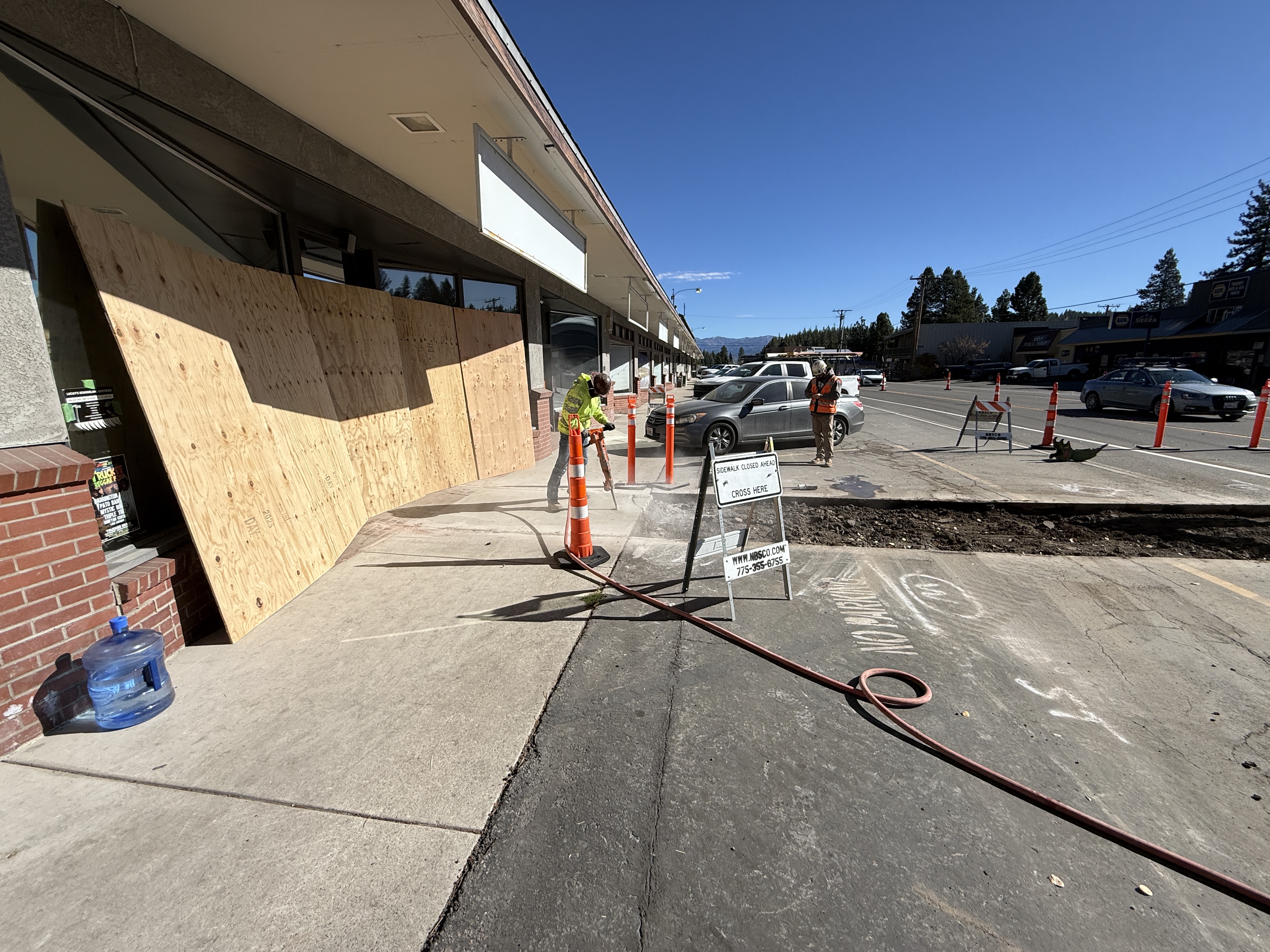 The photo depicts an active construction site involving the excavation of a trench in front of a commercial building. Workers are engaged in the process, with one worker operating equipment near traffic control cones. Plywood is being used to cover the store fronts, indicating protection measures during construction work.