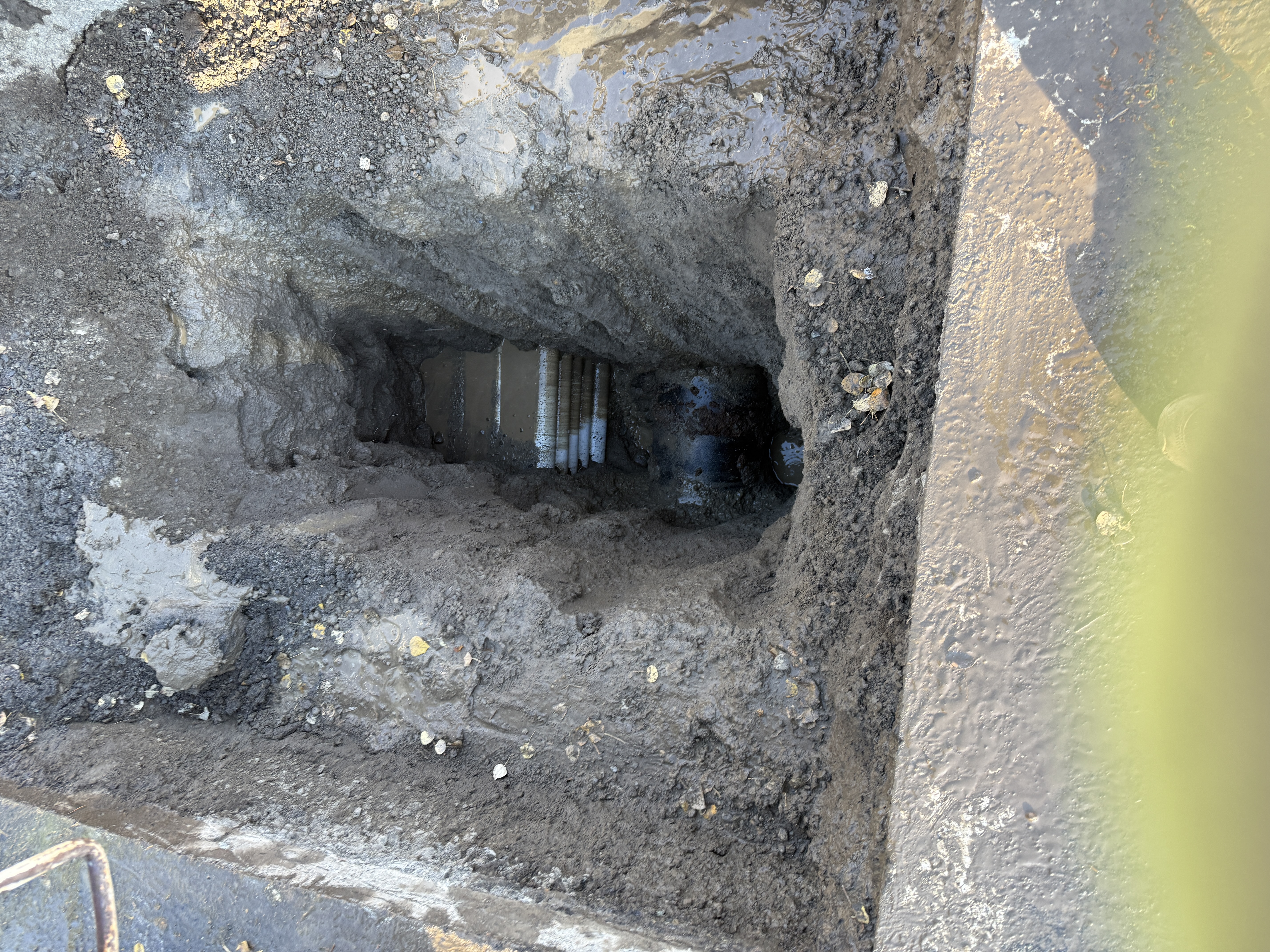 The image shows a trench excavation with visible pipeline components at the bottom. There is evidence of recent digging activity, and the trench appears to be partially filled with water, suggesting either an incomplete installation or active water ingress. The surrounding soil appears loose, indicating recent excavation work.