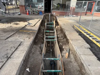 The image shows a partially excavated trench with two visible pipes running horizontally along the bottom. The area is muddy, indicating recent excavation or possible leakage. Shadows suggest it might be late afternoon, and no personnel are visible actively working.