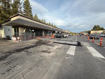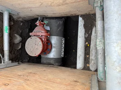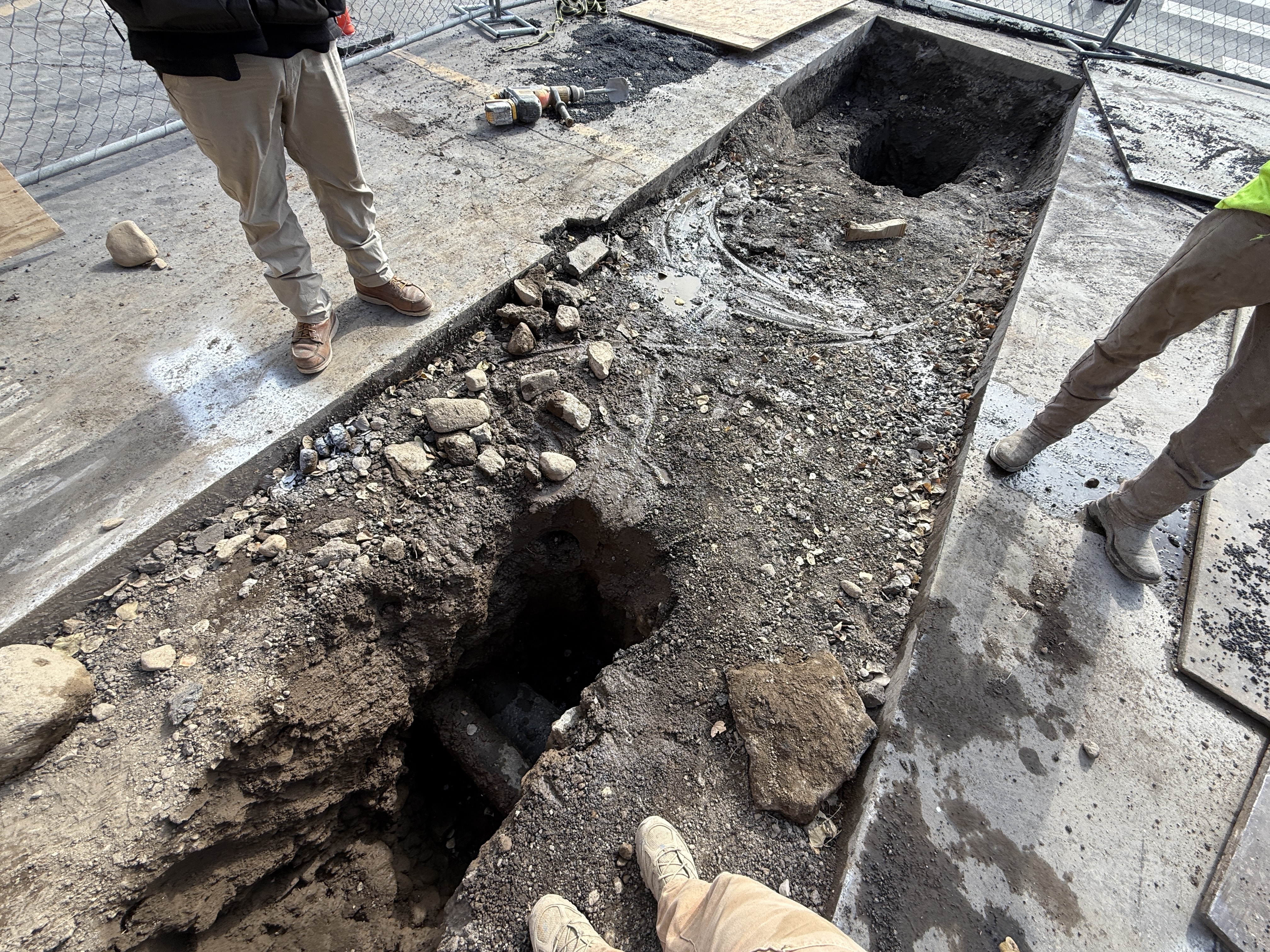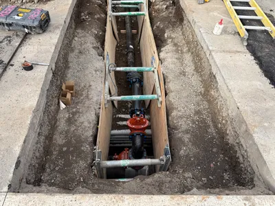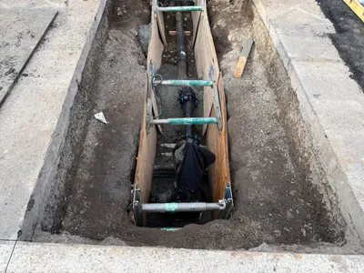 The image shows an active trench excavation on a construction site with two workers standing nearby. The trench is partially excavated, revealing soil and rock debris around the dig. Visible are remnants of infrastructure that might include pipes, though they are not clearly identifiable within the trench. The site appears to be in mid-construction stage with active excavation underway.