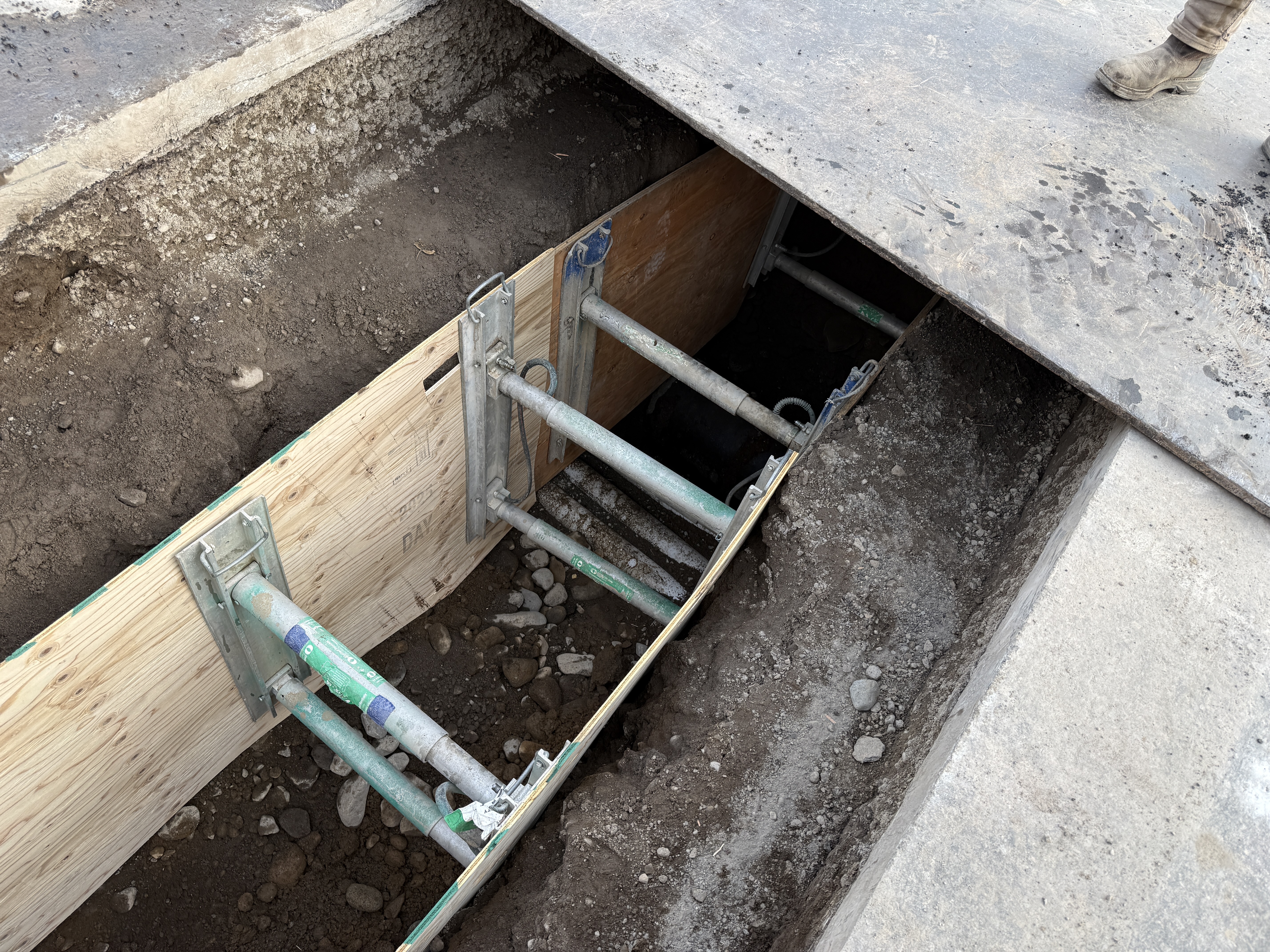 The photo shows a trench excavation at an active water infrastructure project. Shoring components, including steel struts and formwork, are installed for trench support. The trench is partially covered, which indicates ongoing work potentially related to utility placement or inspection. Soil conditions appear stable with a mix of earth and small rocks.