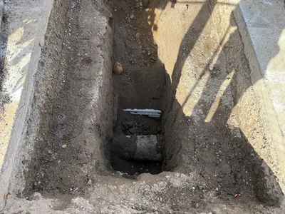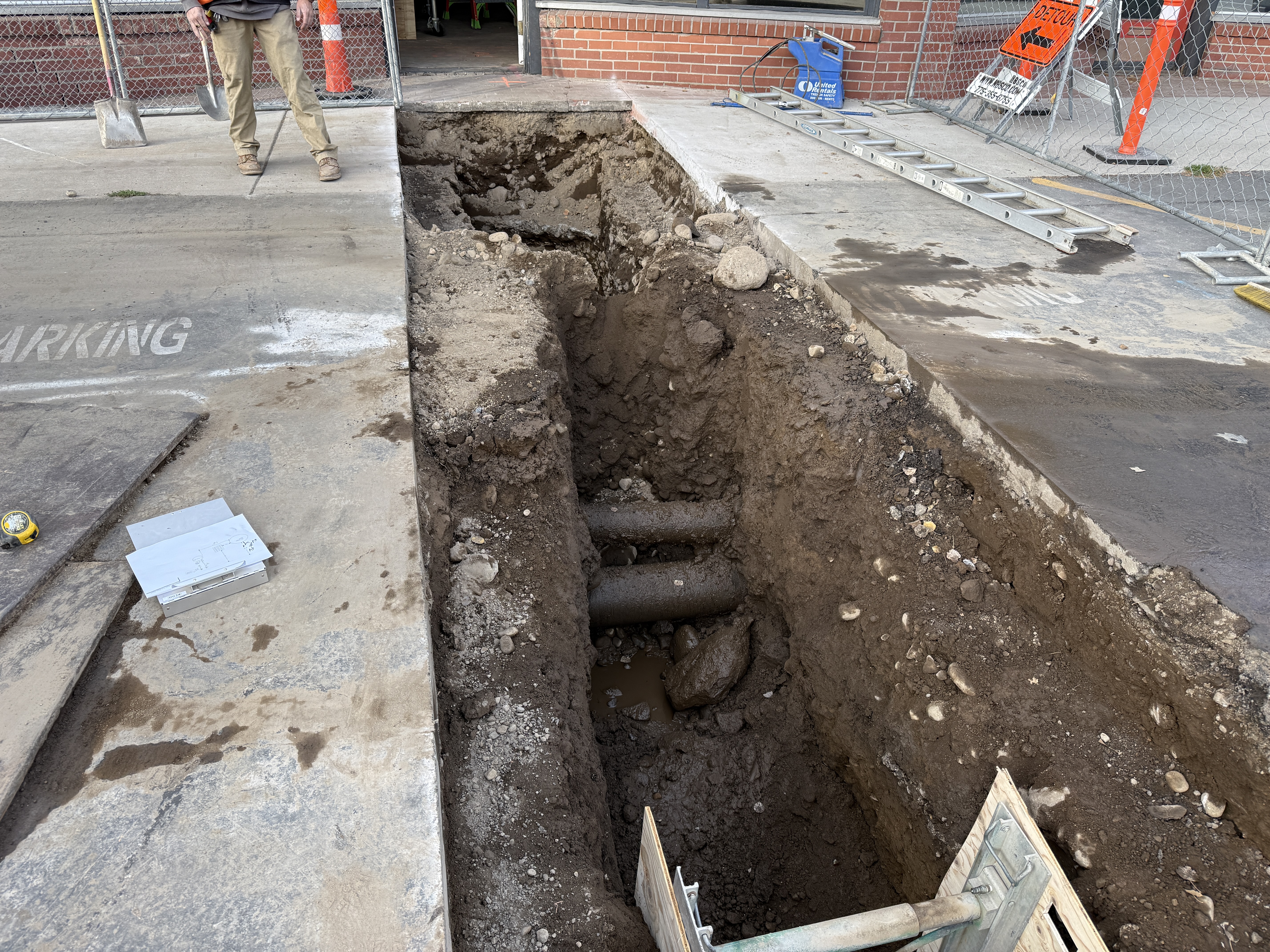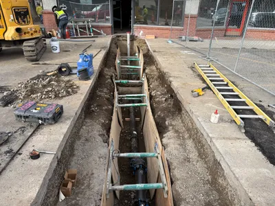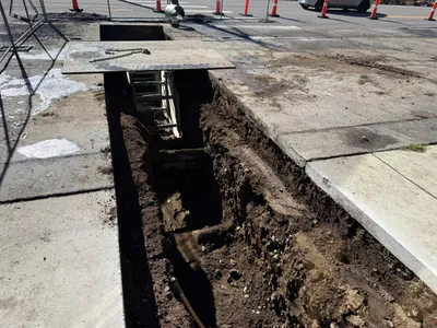 The photo shows a trench excavation in progress with exposed utility pipelines. Soil is piled along the edges of the trench, and parts of a concrete sidewalk are removed. The construction appears to be in the mid-phase of underground utility installation, with no backfill yet applied around the pipes.