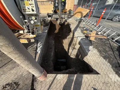 Mid-phase construction with exposed soil in the trench, weather appears clear with daylight conditions.