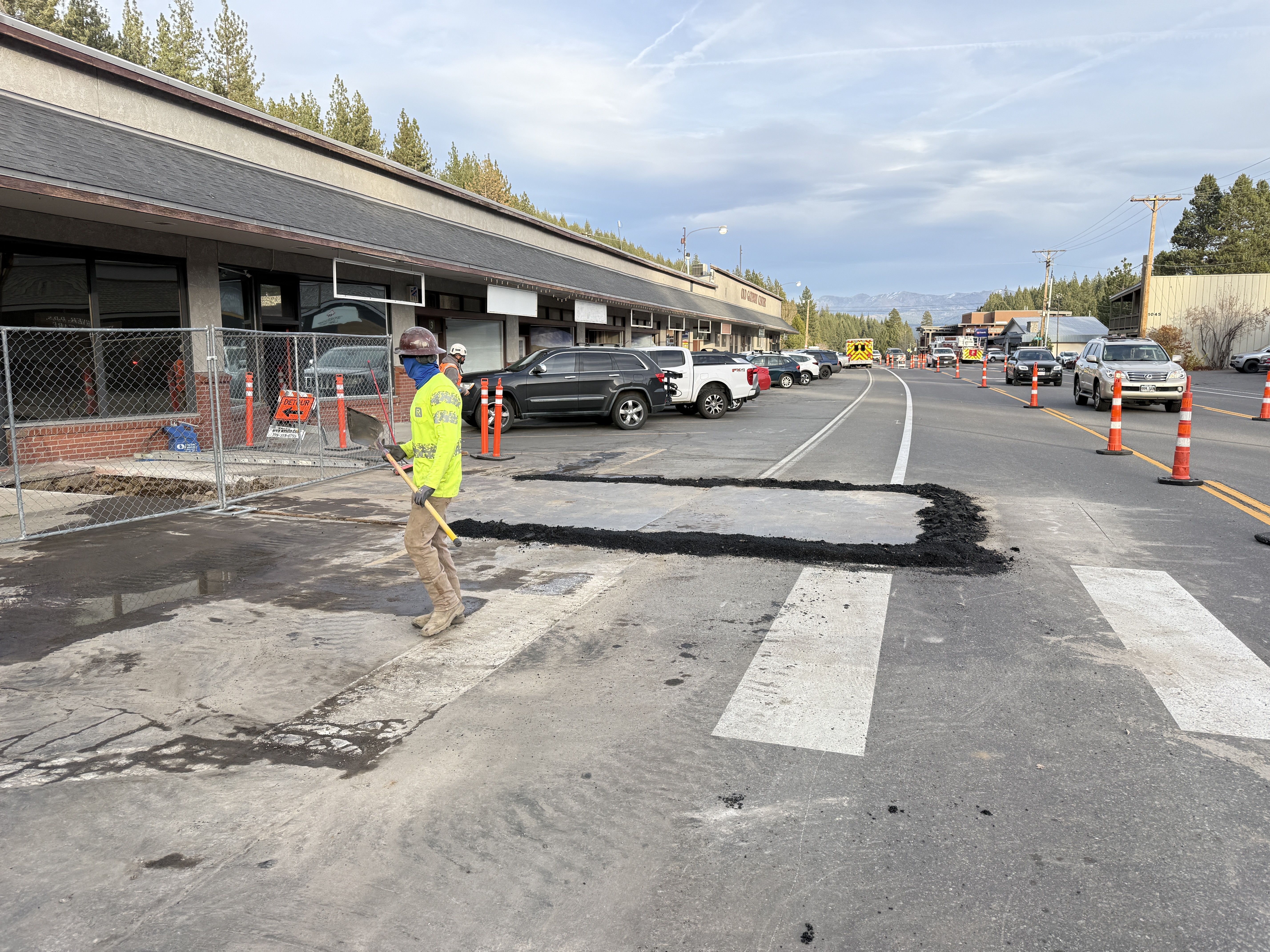 The photo shows a worker engaged in the surface restoration phase of a water infrastructure project. Fresh asphalt is being applied to a patch on the street, likely after utility work beneath the road surface. A nearby fenced-off construction zone indicates ongoing work in the area, and traffic cones are guiding vehicles around the site.