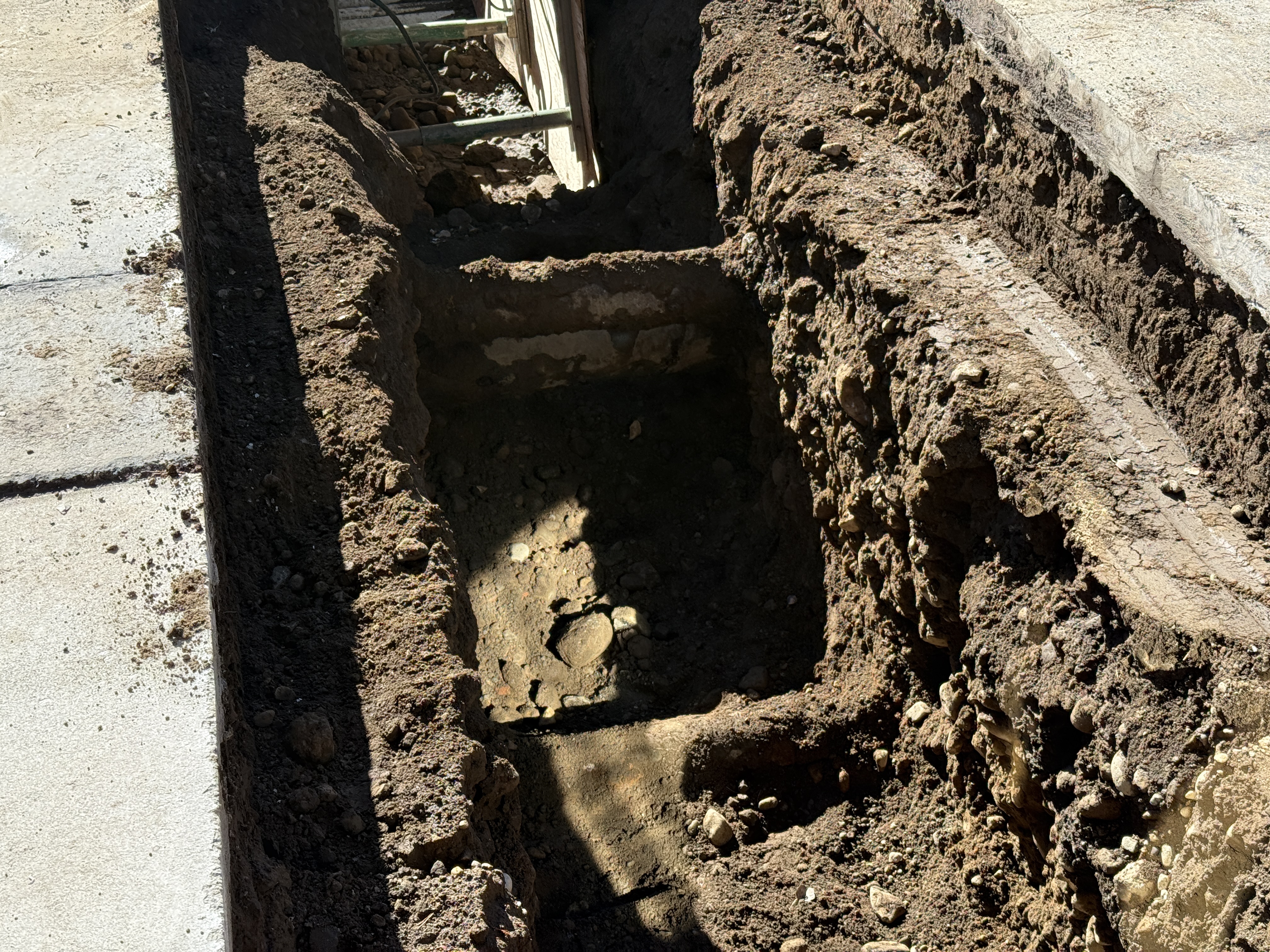 The photo shows a freshly excavated trench adjacent to a concrete surface, likely in preparation for underground utility installation. The trench is approximately one foot wide with a clearly defined edge, indicating careful excavation. The surrounding soil appears dry and compacted, suggesting recent or ongoing excavation activities. No utility pipes or conduit are currently installed, suggesting this is an early stage of the construction.