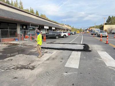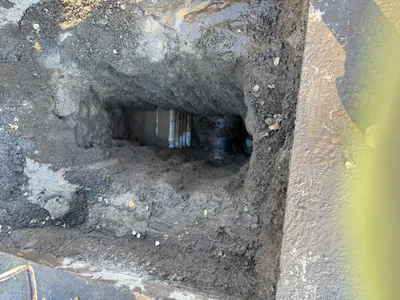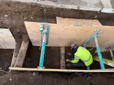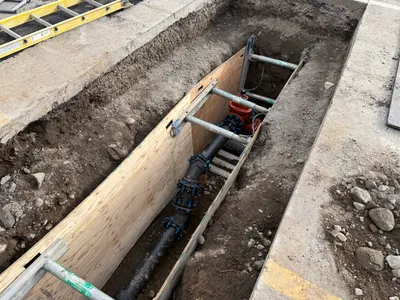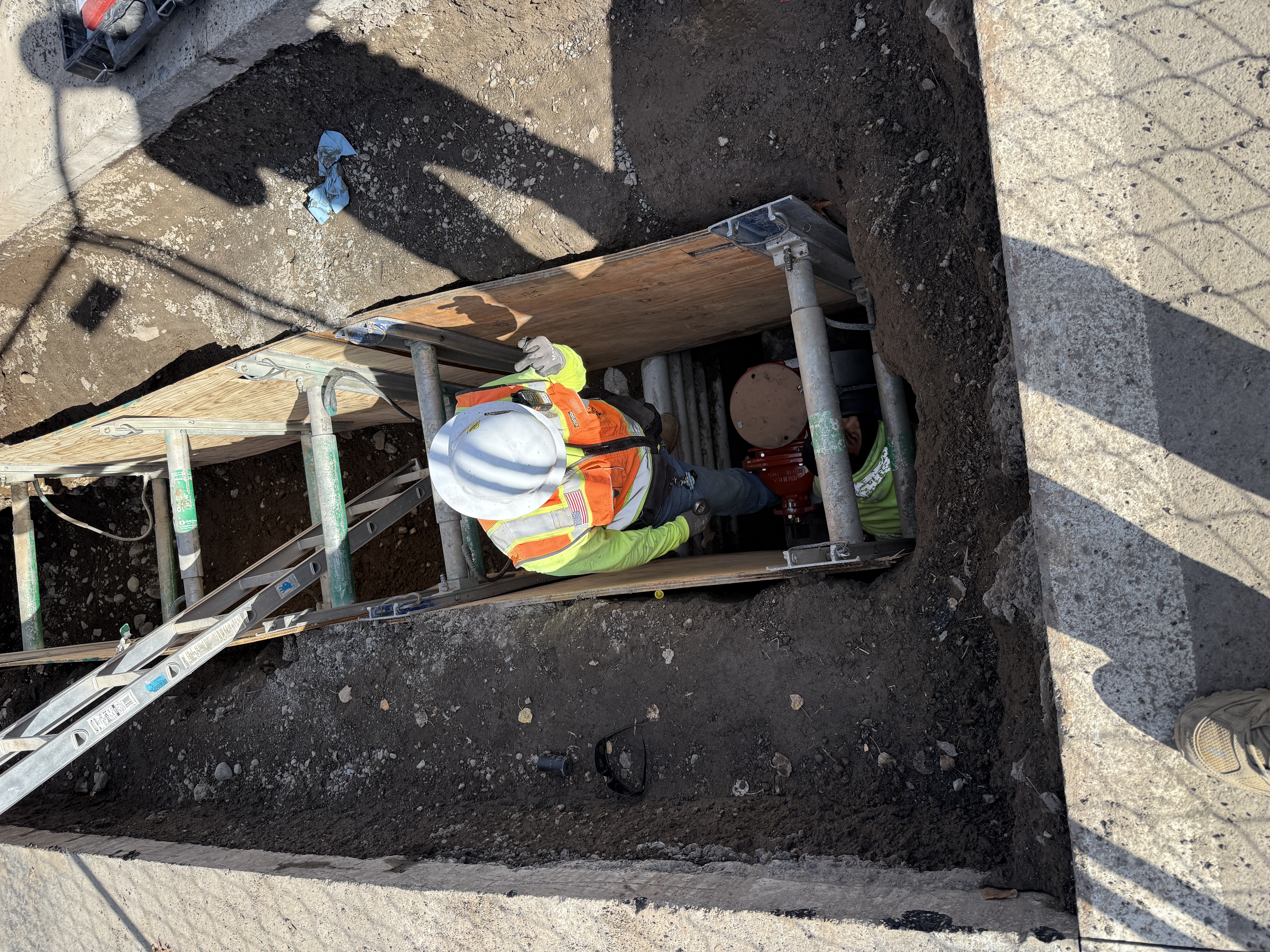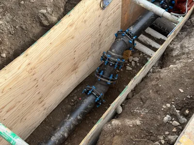 The image depicts a worker inside a narrow excavation site with trench shoring in place. The worker is engaging in valve installation on a ductile iron pipe, as evidenced by the visible valve and the pipe's location within the trench. The site appears well-shored to prevent soil collapse, indicating adherence to safety protocols in excavation work.