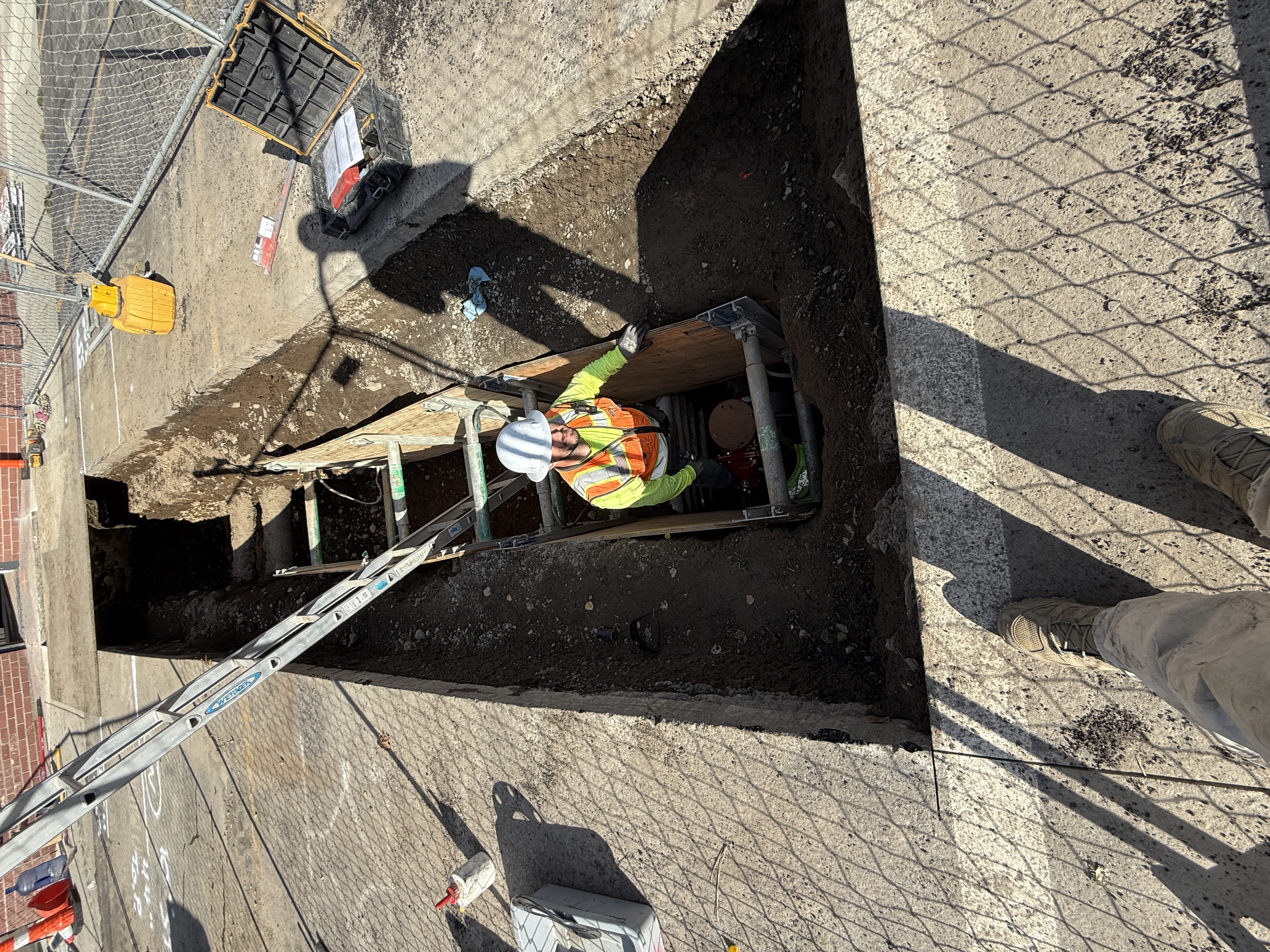 The photo shows a trench with a worker inside wearing standard PPE, setting up or inspecting what appears to be shoring materials to prevent collapse. The trench is part of a water infrastructure project, with visible ladders allowing access. The site is fenced for safety and organization, indicating a controlled environment for underground work.