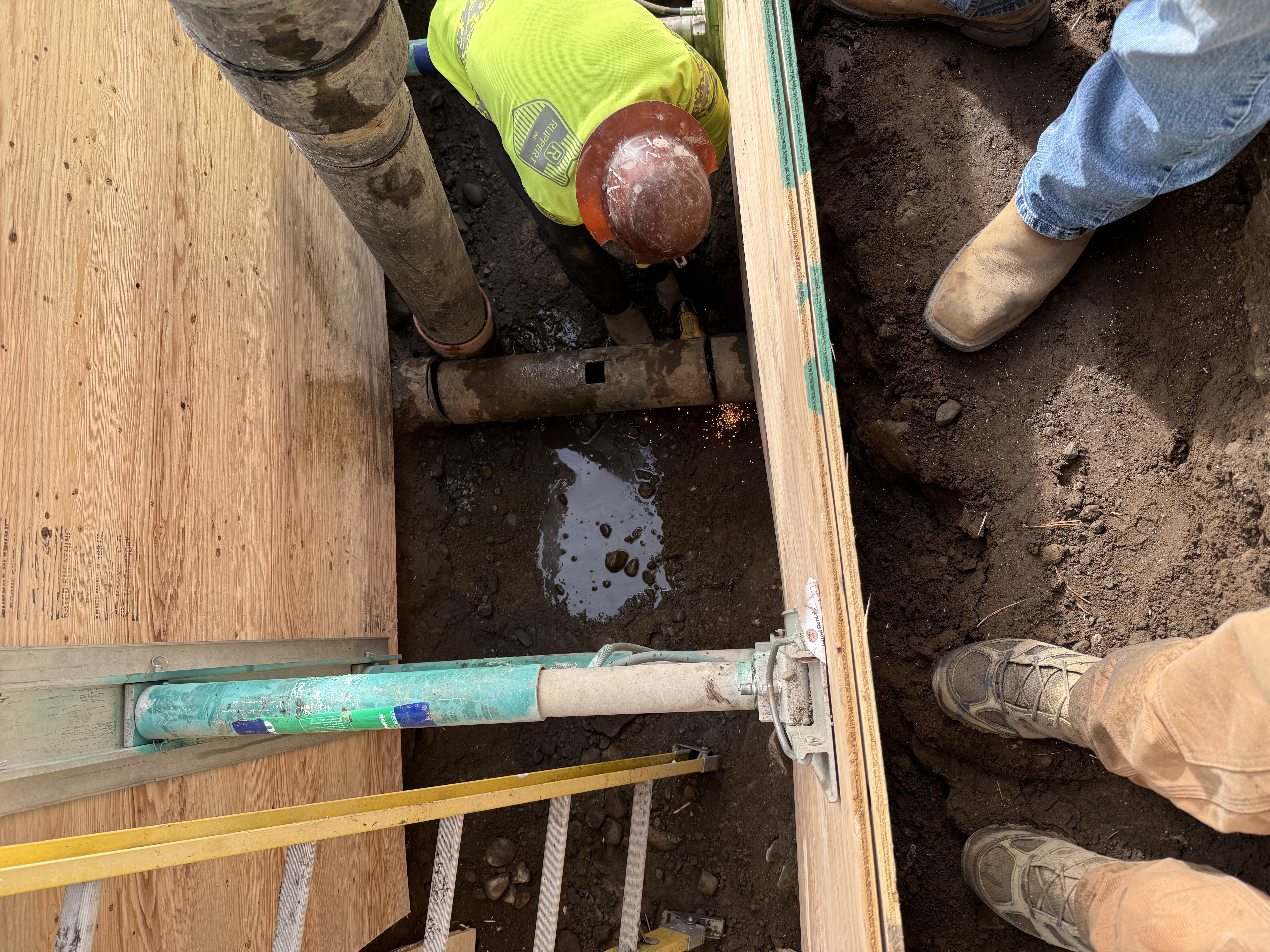 A worker is engaged in pipeline installation within a trench, evidenced by visible ductile iron pipes and sparks from metalwork indicating cutting or welding activity. The trench is reinforced with shoring panels, possibly for safety and structural support. The worker is wearing appropriate construction attire while performing technical tasks. Ground conditions include visible moisture, suggesting either recent precipitation or water leakage.