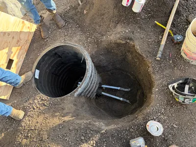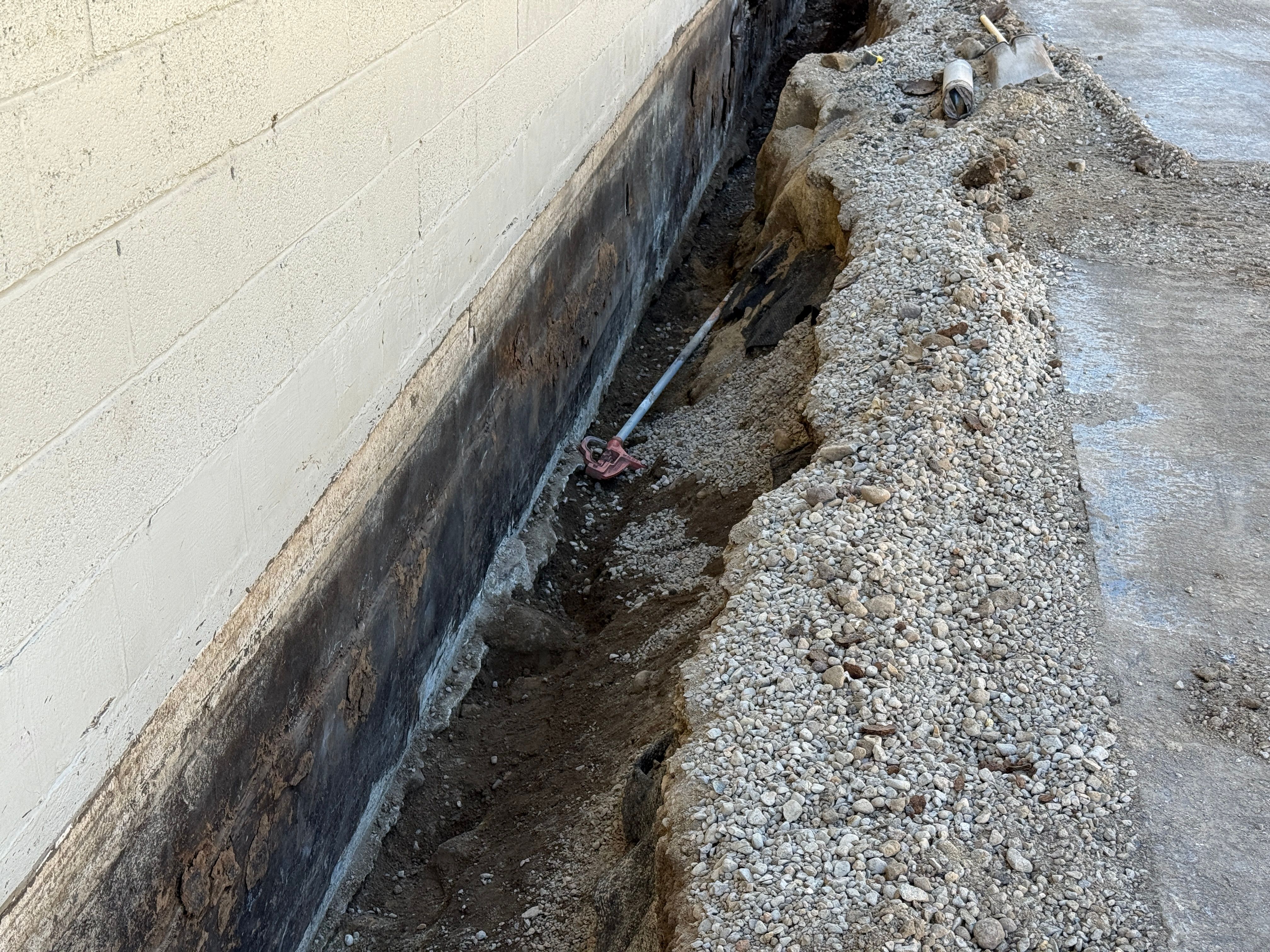 The image depicts an open trench adjacent to a building foundation, likely for underground utility work. The trench shows exposed soil and gravel backfill along with visible waterproofing on the building's foundation wall. A pipe is partially visible, suggesting preparatory or ongoing installation work. The site appears to be in the trench excavation stage with some backfill present.