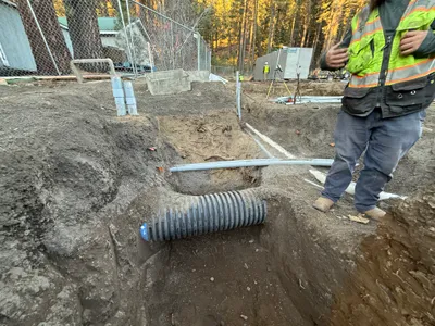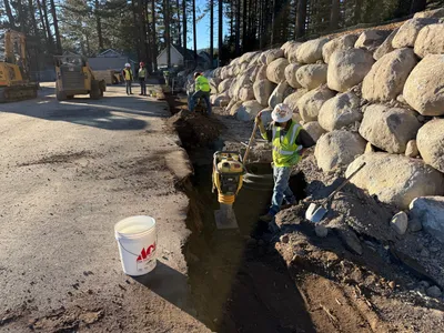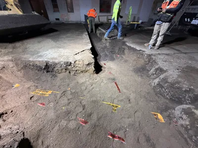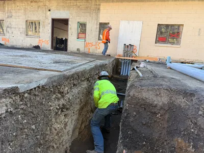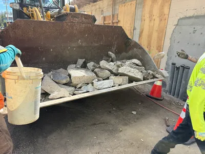 The photo shows a construction site with a large front loader containing rubble and concrete debris in its bucket. Workers are using tools, such as a bucket with wooden handles, to collect materials. The area appears to be in the demolition or excavation stage of construction, with plywood board protecting adjacent structures. There are traffic cones for safety marking the boundary of the work zone.